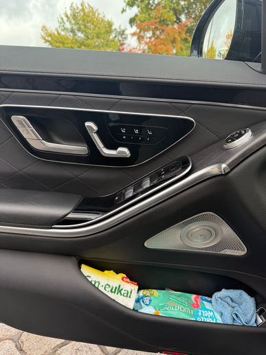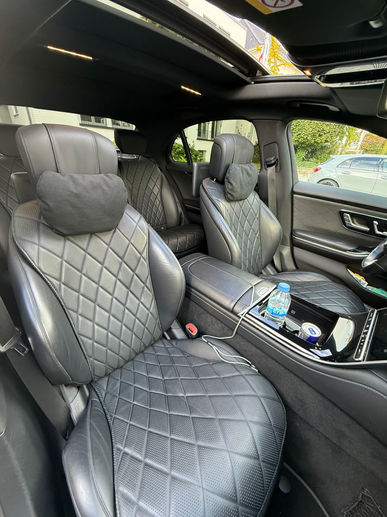 Der Innenraum überzeugt mit hochwertigem Nappa-Leder in Rautensteppung, einem Burmester 3D-Surround-Soundsystem, Fond-Entertainment mit zwei Bildschirmen, Panorama-Schiebedach, mehrfarbiger Ambientebeleuchtung, Soft-Close Türen sowie elektrisch verstellbaren Komfortsitzen mit Memory-Funktion und Sitzheizung vorne und hinten. Darüber hinaus verfügt die S-Klasse über modernste Technik und Assistenzsysteme wie Distronic, Spurhalte- und Totwinkel-Assistent, 360° Kamera, Head-Up Display und 4-Zonen-Klimaautomatik.